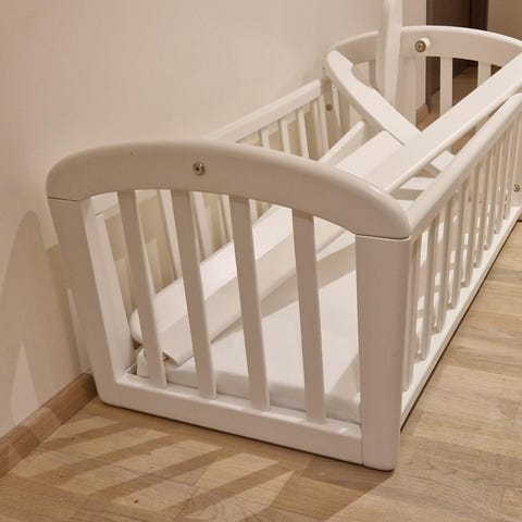 Hyvässä kunnossa oleva lasten kehto ilman patjaa. Meillä oli ”patjana” ihan vilttejä viikattuna.