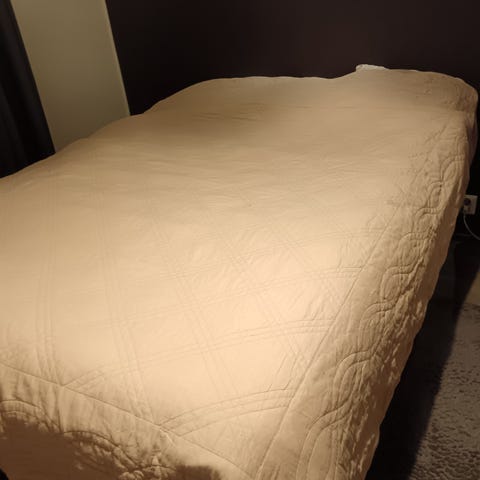 Myydään kevyt 100% puuvillainen päiväpeite ja kaksi koristetyynyä. Kauniit vaaleat sävyt. Sopii 120cm sänkyyn seinää vasten tai sitä kapeampaan. Muutamia pieniä jälkiä ks. kuvat. Toisessa tyynyssä tummumaa.
