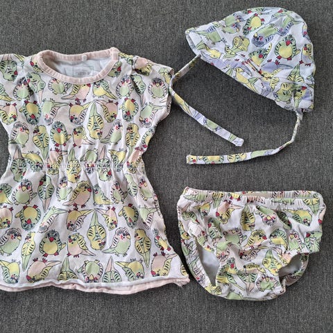 Myydään hyväkuntoinen kesäasu, napitus alhaalla, pienet lahkeet, hihaton.