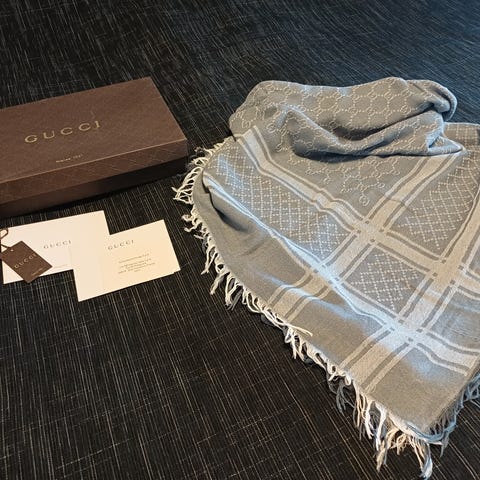 hyväkuntoinen aito Gucci silkkihuivi. Huivin päärmeet ja vyökuviot harmaat. Huivin pohjavärin oikea sävy näkyy parhaiten pikkukuvassa, jossa Gucci-teksti. Koko 85x85 cm.