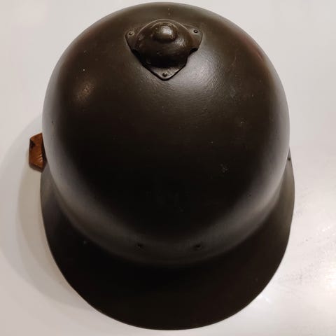 Myydään saksalainen, teräksinen sarvikypärä m/16 suomalaisin sisuksin. Suomen Puolustusvoimien käytöstä poistama. Hyväkuntoinen, sisukset uuden veroiset. Kypärän lierin suurin pituus 31,5 cm ja leveys 23 cm. Sisällä oleva nahkahihna 5 cm leveä ja ympärysmitta 62,5 cm.
