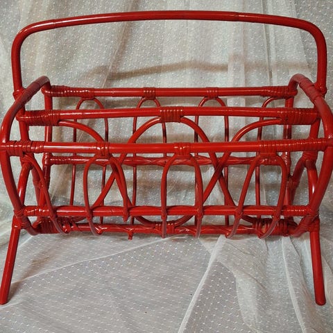 Täysin ehjä, vanha rottinkinen lehtiteline. Kaunis siro muoto. Leveys 38 cm, kokonaiskorkeus 43 cm ja edestä takse 26 cm.