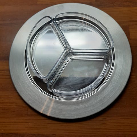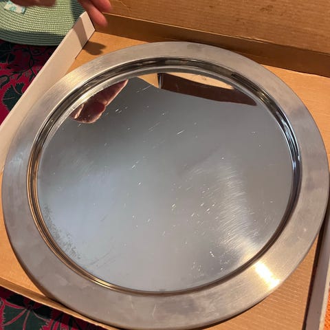 Teräskulho ja teräslautanen. Lautasen halkaisija 32 cm. Molempia käytetty 2-3 kertaa. Lautasessa jokusia naarmuja, samoin kulhon pohjassa. Design Timo Sarpaneva. Lautasen pohjassa mainos. Valmistaja Opa Oy Suomi.
