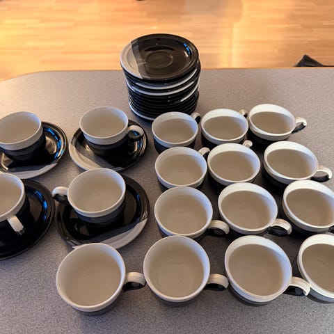 6 kuppia (kupin vetoisuus 1,5 dl) , 6 tassia, 6 kakkulautasta sekä tarjoilulautanen.