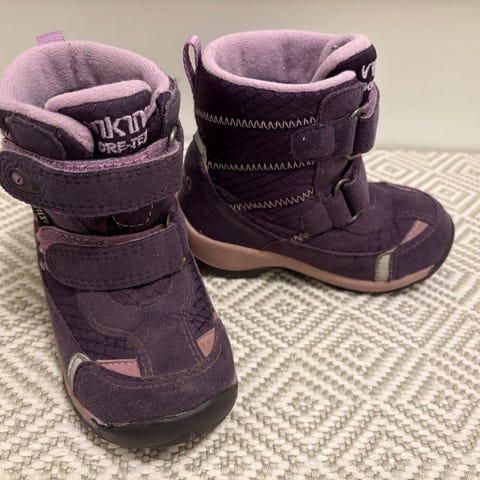Tummansiniset Viking Goretex välikausikengät heijastavilla yksityiskohdilla, koko 23. Kärjissä hieman kulumaa (näistä kohdista heijastava pintakerros kulunut), mutta pinta on muuten ehjä. Edessä olevista ompeleista alemmat kuluneet.
