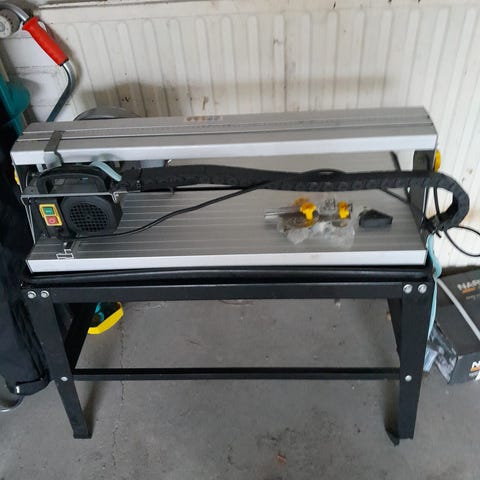 Laattaleikkuri Montolit. Leikkuri on käyttämätön ns. kaarileikkuri jolla voi leikellä esim. pyöreän pilarin ympärille laatat. Mukana on yksi kaarisapluuna. Leikkuupituus noin 600 mm.