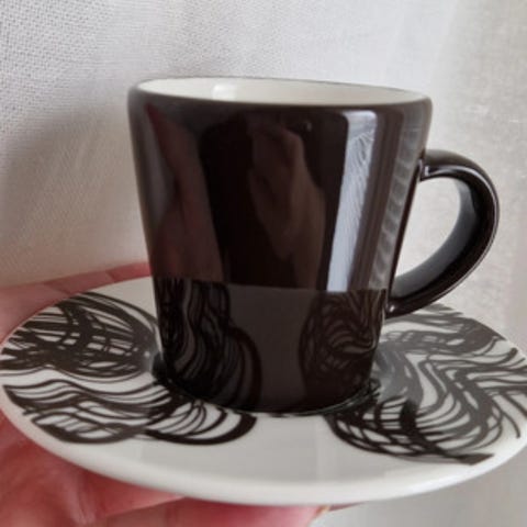 Myydään Iittalan Graphics-sarjan ruskea espressomuki ja aluslautanen.