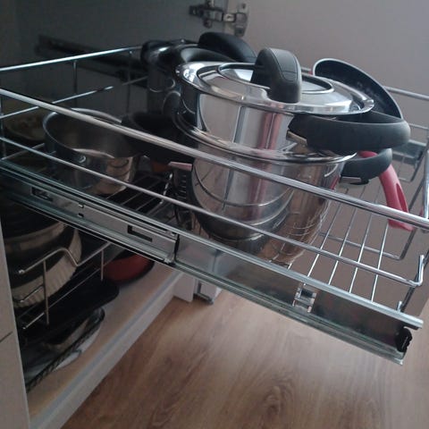 Kiinnitetään kaapin seinämään, tulee kokonaisuudessaan ulos. Alatasolle saa imurin ja ylemmille muuta.