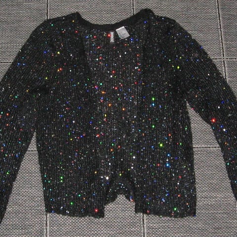 Glup paljettibolero koossa 152. Vain juhlissa käytetty, muutamassa kohdassa silmukat hieman venyneet, muuten ehjä ja siistikuntoinen. Kaunis sydännappikiinnitys.