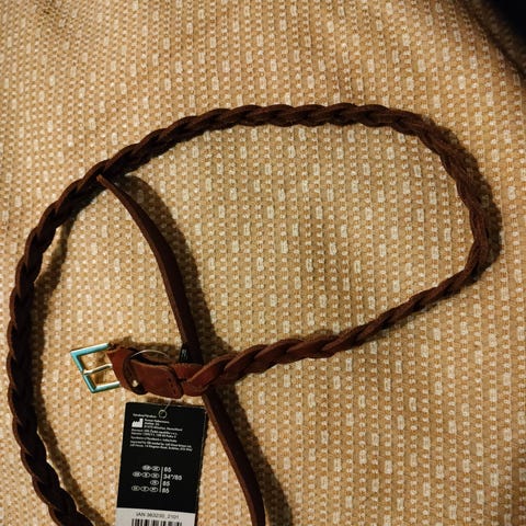 Myyntiin naisten uusi, ruskea nahkavyö. Kokonaispituus 85 cm, leveys 4,5 cm.