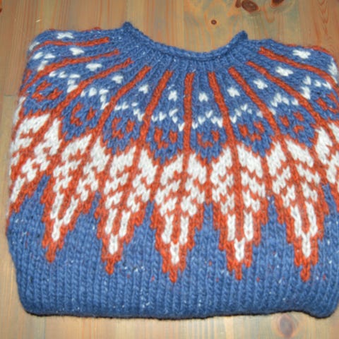 Lämmin ja kevyt neule islantilaislangasta. Oma malli, joten täsmälleen samanlaista ei luultavasti tule vastaan. Pääväri meripihka. Neulottu kaksinkertaisella langalla.