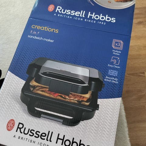 Uusi ja käyttämätön hampurilaisgrilli avaamattomassa alkuperäispaketissa.