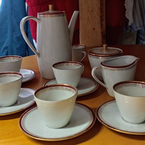 Ruusukuvioinen Bavarian kahviastiasto, kahvikannu, sokerikko ja kermakko. Astiasto on 12 henkilölle. Tuotu aikoinaan Keski-Euroopasta.