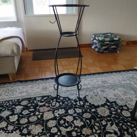 Tarjoiluteline kolmella korilla. Kokonaiskorkeus noin 50 cm.