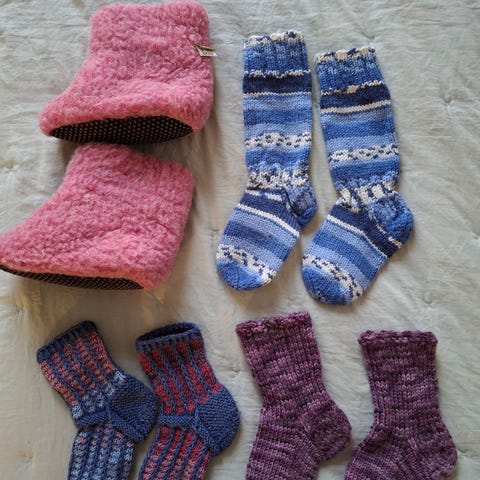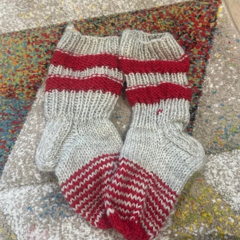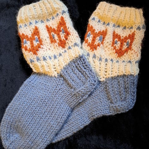 Käsin neulotut villasukat joiden koristereuna on virkattu.