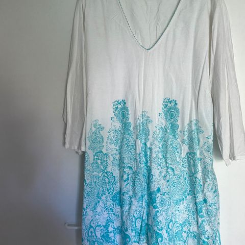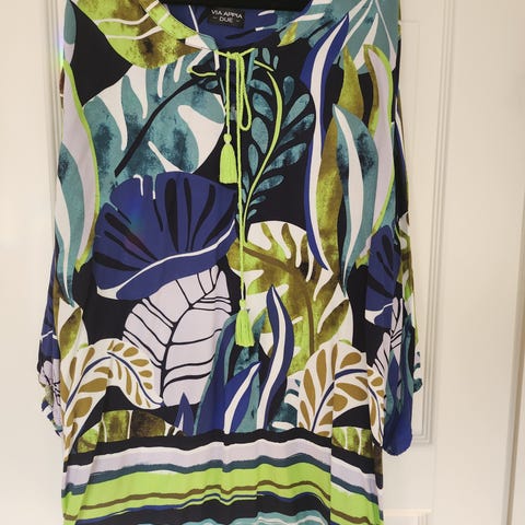 Iloisen värinen, keltainen viskoosi tunika jossa kukka kuvioita. Lyhyet hihat. Koko 54/56