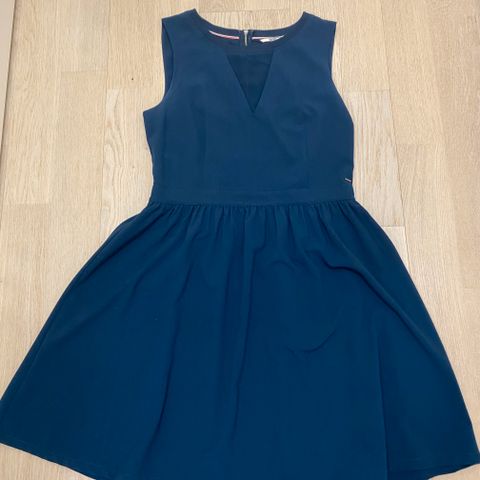 Uudenveroinen Hilfiger mekko. Vekitetty helmaosa, jonka alareuna kukkakuosinen. Vyötäröllä kuminauha ja solmittava vyö, rinnassa pikku tasku, olkapäillä koristenapit. Materiaali polyester, tummansininen vuori ohut puuvillakangas. Koko M