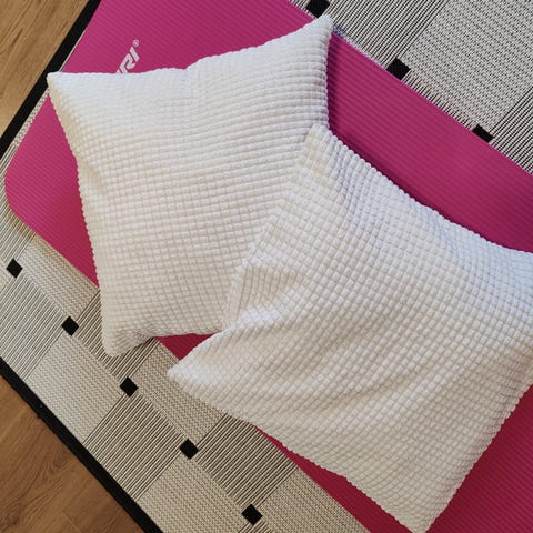2kpl neliön muotoisia isoja tyynyjä á 15e. Mitat: 55cm x 55cm.