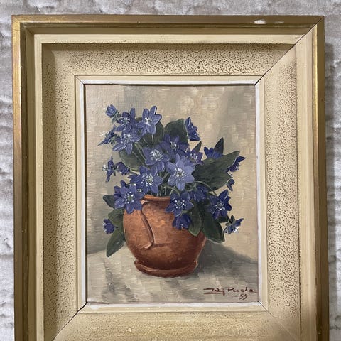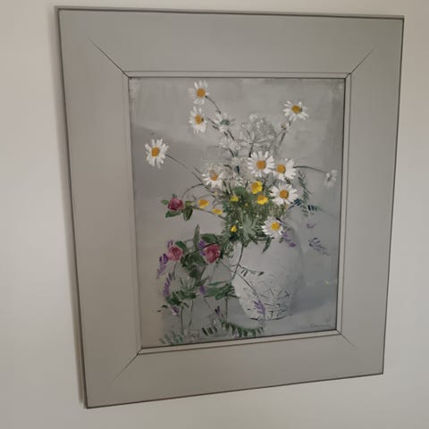 Myydään kaunis kukkataulu, jossa valkoiset puukehykset.