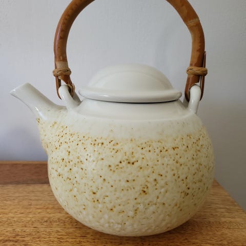 Puolen toista litran teekannu ja neljän desin teekuppi kivan kesäisellä kalakuvioilla. Ovat posliinia.
