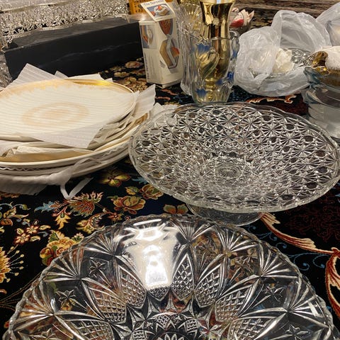Neljä teekuppia, noin neljä desiä, neljä tarjoilu lautasta sekä yksi tarjoilukuppi ja sirottimet.