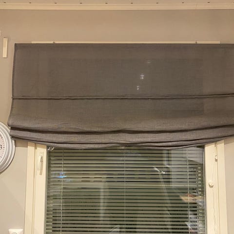 Laadukas beige/ valkoraidallinen laskosverho. Leveys 130cm.Hinta 30€