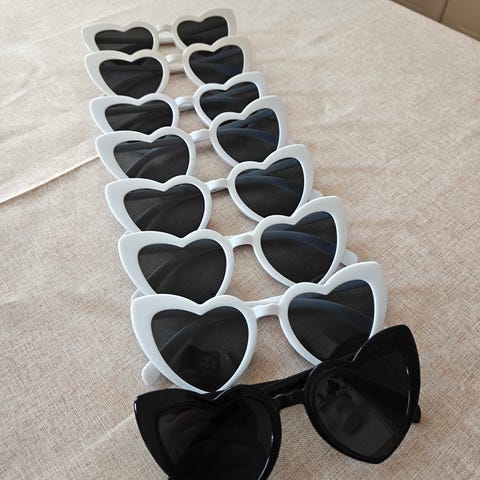 Vaaleanpunaiset sydänaurinkolasit esim. kuvausrekvisiitaksi