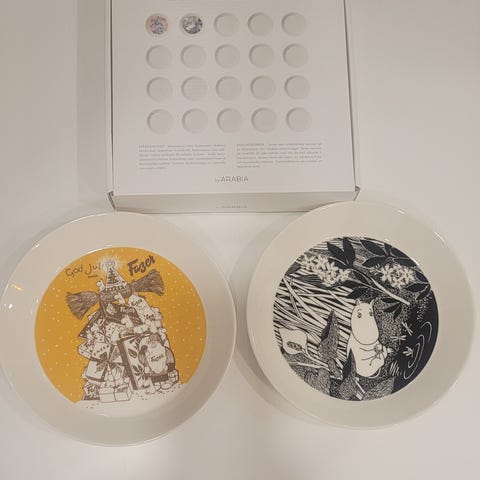 Myynnissä kuvassa olevat pienet Arabian valmistamat seinälautaset.Kaikki omissa peketeissaan.Siis lautaset ovat uusia,ehjiä,siistejä ja puhtaita.