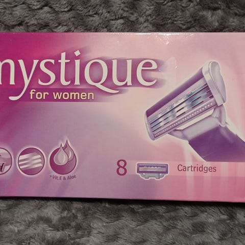 Mystique for women. Pakkauksissa höylä, kaksi terää ja teline.