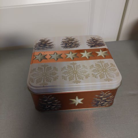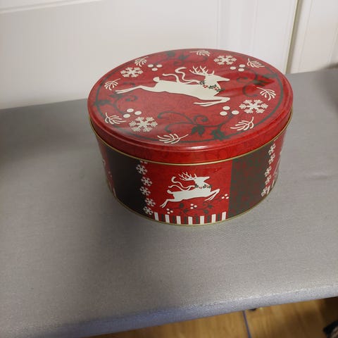 Vanha pyöreä hopeanvärinen peltipurkki (käytön jäljet näkyvät, paljon naarmuja ja muita epätasaisuuksia). Tyydyttävä kunto.