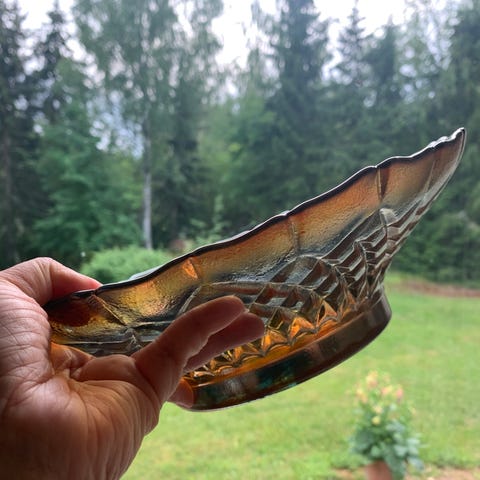 Kaunis jalallinen hedelmäkuvioinen lasinen tarjoilukulho/hedelmäkulho
