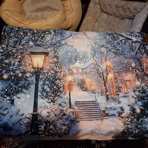 Toimen puoli sinikuviollinen, toinen puoli yksivärinen beige.