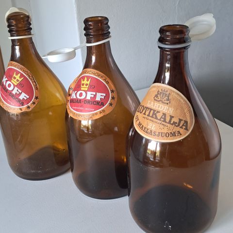 Vanha kotikalja ruskea pullo, 2L, karhulan lasi, korkilla. Hyvä kunto.