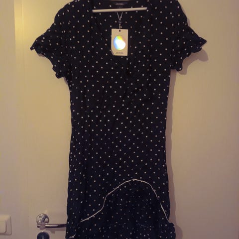 Mekossa laput kiinni ja mekko on käyttämätön, mutta kauluksessa on jotain vaaleaa tahraa sovitusten jäljillä.