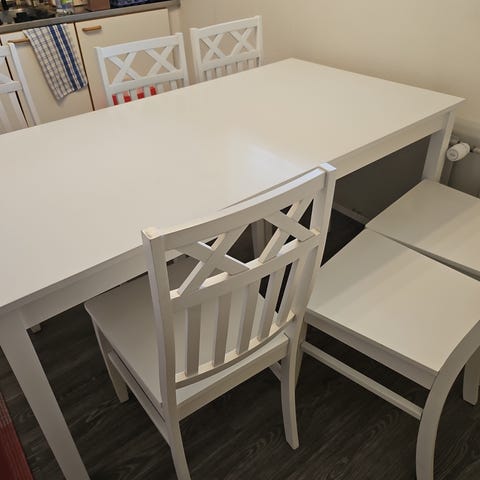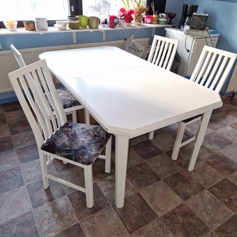 Mänty pöytä ja tuoleja 6 kpl. ov 65 E kpl:+Pöytä 350 E. Viiluista rakenne pöydän kansi. jatko pala 45 cm kuvissa paikoilaan mitta 200 cm . leveys 100 cm. korkeus 73 cm. Kunto hyvä. jalat irroitettavissa. OH 850 Euroa . kotimainen .Nouto.. hinta pyynti olis 600.Euroa Hinta tiukka.!!