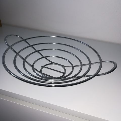 Tarjoiluastiassa posliinia, metallia ja punosta. Halkaisija on 34 cm.