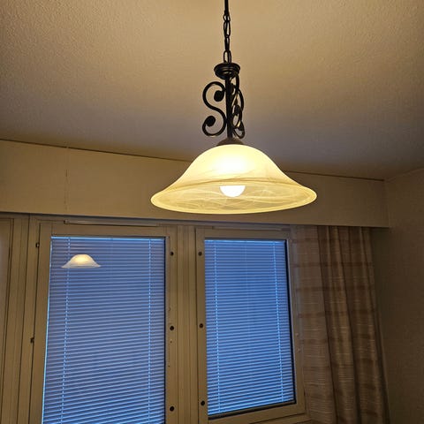 Korkeus noin 42cm. Vepsäläiseltä hankittu halogeenivalaisin. Pitkä johto eli käy aika korkeaankin tilaan. Antaa kauniin valon ympärilleen lasin läpi. Vain nouto Rautaniemestä.