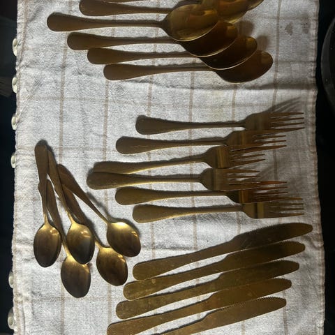 Myydään Bitz-aterimia, messinki viimeistely. Hyväkuntoiset. Tanskalaista designia.