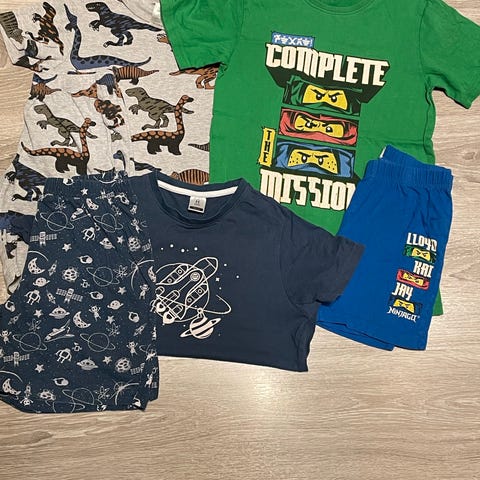 Ehjiä ja siistejä. Yöppöhousujen polven kohdalla värin haaalentumaa, ei kulumaa. Paidan painatus virheetön. LEGO-kauluspaita juhlakunnossa.