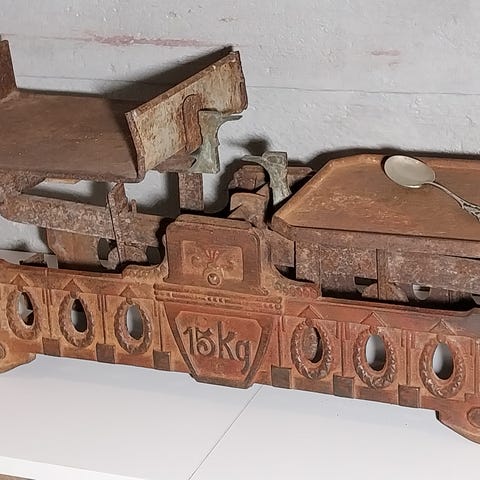 Vanha puntari kalan, lihan, jauhojen, perunoiden ym. punnitsemiseen Vuonna 1943 valmistettu.