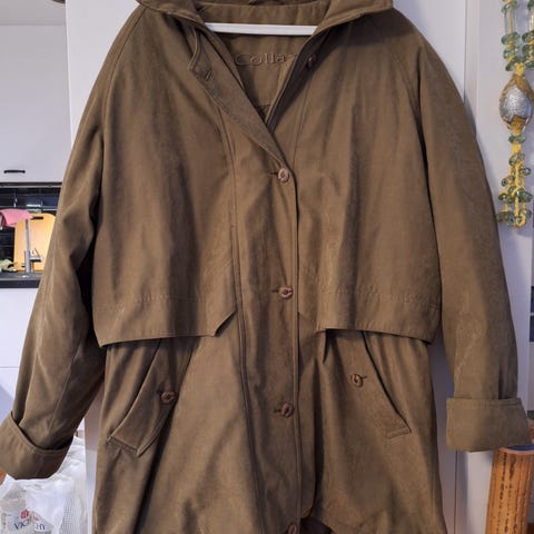 Musta hieman viittamainen erittäin lämmin takki irroitettavalla hupulla, merkki Collage clothing, koko 38, mutta väljä. Hinta 35 euroa
