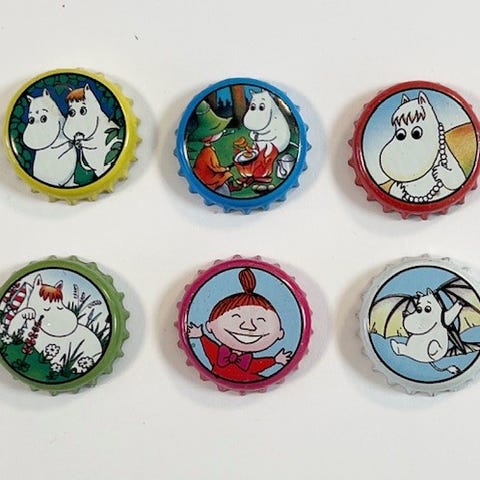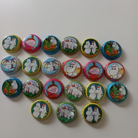 Kruunukorkkeja Muumi limsoista. Jotain avaamisesta tullutta jälkeä on.