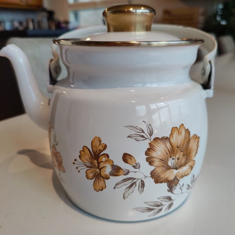 Finel, Finell, Finelin, Finellin, emalinen, kahvipannu, teepannu, pannu, emalipannu, 2 l, 2 litran, Hackman, Olga Osol, v. 1980, 1980-luvun, joulu, joululahja