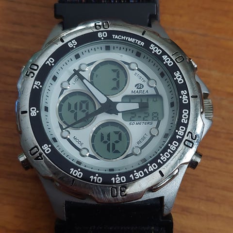 Marea kello zirkoneilla ja päivällä. Toimii pattereilla. Takuutodistus- ja ohjekirja. Vähän käytetty.