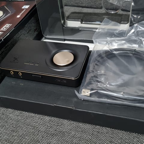 Uusi äänikortti paketissaan. Käynyt koneessa sisällä, mistä naarmu bracketissä.