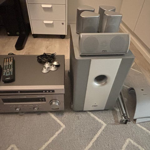 Uutena 12/2005 hankittu ja satunnaisessa vähäisessä käytössä ja jo useita vuosia käyttämättä ollut YAMAHA RX-V340RDS -kotiteatterisarjan viritin, vahvistin subwoofer, yksi etukaiutin + 4 kaiutinta ja alkuperäiset kokoonpanon piuhat.