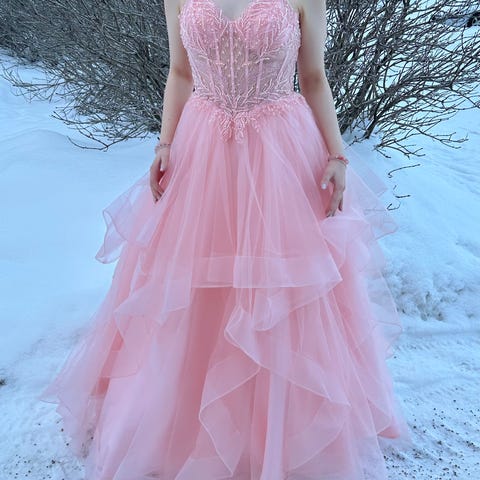 Myydään uutena Tampereen Zazabellasta ostettu vanhojentanssimekko. Ollut päällä vain yksissä tansseissa, mekko todella hyvässä kunnossa. Koko 38 ja sävy beach! Avoin selkä ja tukevat olkaimet, jonka vuoksi pysyy hyvin päällä, takana vetoketju.