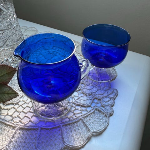 Hienot harvinaiset kauniit vintage lila / violetti sokerikko ja kermakko, metallivanteeseen puhallettu lasi, design Jan Salakari Kumela Oy. Sokerikossa yläreunassa sisäpuolelta lohjennut pieni "lasilastu" (katso ensimmäinen lisäkuva) ja kermakossa pieni naarmu (katso toinen lisäkuva). Kuparivanteessa leima, jossa ympyrän sisällä Suomen ääriviivat (Suomen Matkailuyhdistys). Yhteishinta 30 e. Voin myös postittaa, jolloin postimaksu on 8,90 e.