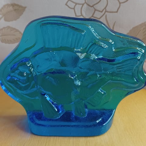 Kirjava koriste lasikala. Korkeus n.9 cm ja pituus 16 cm.