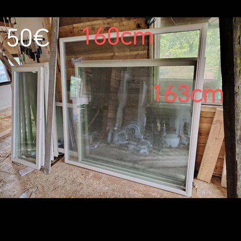 Alumiiniprofiililla olevia ikkunoita kahta eri kokoa. Käyttämättömiä